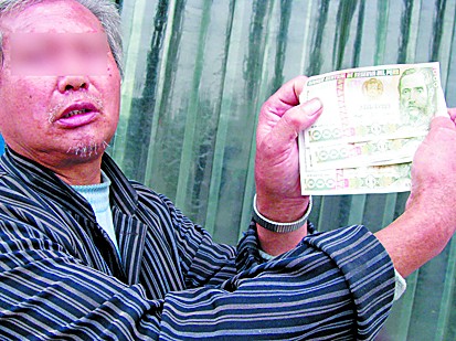 17日,記者在振華路見(jiàn)到了被騙走6000元的譚老先生。他告訴記者,17日下午1時(shí)左右,他在滄口廣場(chǎng)附近收廢品,突然有兩個(gè)20多歲的年輕人與他搭訕。這兩個(gè)年輕人自稱來(lái)自福建,與老板三個(gè)人一起來(lái)青島出差。到青島后,他們的車出了車禍,老板已經(jīng)被送到了醫(yī)院,急需交住院費(fèi),但是無(wú)奈身上只帶了一些外匯,來(lái)不及去銀行兌換,所以想跟譚先生兌換6000元錢。其中一個(gè)年輕人拿出5張外匯,每張外匯上標(biāo)有“1000”的字樣,并告訴譚先生,這5張1000元的英鎊值1萬(wàn)多元人民幣。譚先生覺(jué)得很劃算,于是從家里拿了6000元錢與對(duì)方兌換。