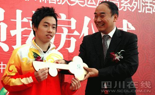昨天上午的成都溫江金強(qiáng)大學(xué)城廣場前熱鬧非凡,四川省體育局在此表彰北京奧運會上奪牌的川籍運動員。鄒凱、呂遠(yuǎn)洋、陳朝霞、張益萌、蔣婷婷、蔣文文和王娜等在北京奧運會上為四川爭光添彩的運動員接受了由某房地產(chǎn)商贈送的住房。其中,獨攬三金的“體操王子”鄒凱開心地接過了一套近200平方米躍層住房的鑰匙,而帆板金牌得主殷劍則獲得一套三居室住房,此外,獲得北京奧運會銀牌和銅牌的四川選手也分別獲得套二和套一的住房。
