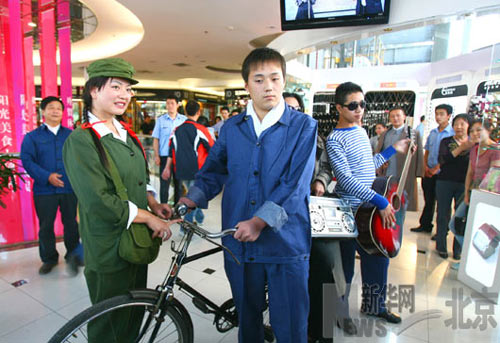 其中,一個(gè)代表上世紀(jì)70年代工人形象的男士身穿一身藍(lán)色工作服,推著一輛老式“永久牌”自行車(chē),展示著當(dāng)年的“流行風(fēng)尚”;一個(gè)小伙子身穿;晟、戴著蛤蟆鏡,手彈吉他,邊走邊唱,這是上世紀(jì)80年代時(shí)尚潮流青年的形象再現(xiàn)。