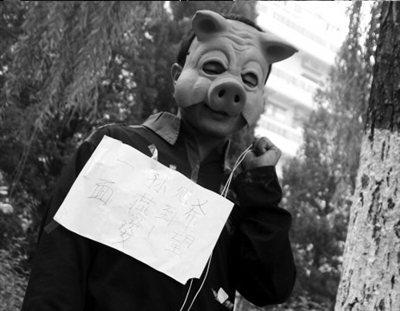 小劉說,他也是艱難考慮了一年才作出這個(gè)決定的。他說,戴面具不是因?yàn)榕滦,而是怕給家人帶來影響。至于專門挑選的豬頭造型的面具,則是“因?yàn)槲乙仓雷约旱男袨楹苌怠。小劉的行為引來了路人的關(guān)注和質(zhì)疑!澳袃合ハ掠悬S金,你這么做都對(duì)不起父母,給我起來!”一位老人嚴(yán)厲地說。面對(duì)質(zhì)疑,小劉一再表示,要跪到堅(jiān)持不住的時(shí)候再走,“我這一輩子只做這一次”。直至下午1點(diǎn),小劉最終放棄了跪求,休息過后自行離開。