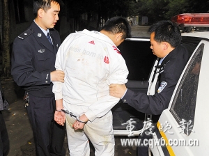 至昨下午4時(shí)許,南岸警方結(jié)束對(duì)被抓獲男子的突審,移交南川警方。男子身穿一套白色運(yùn)動(dòng)服,脖戴1條很粗的金項(xiàng)鏈。(首席記者 黃艷春/文 記者 冉文/攝 郭娟/制圖)