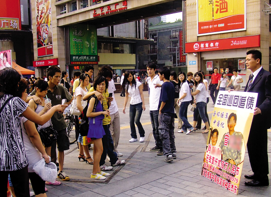 記者接報來到上下九廣場,果然見一男子西裝革履,手舉一塊半人多高的塑料牌,上面印有欠款方“南方某房地產(chǎn)開發(fā)公司”的兩位負(fù)責(zé)人曾某及肖某的照片和姓名,上面赫然寫著“全國巡回追債”,并不忘交代自己的身份“中國搖滾領(lǐng)袖毛杰東”。