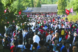 昨日,進(jìn)入香山公園觀賞紅葉的游客人數(shù)達(dá)到了8萬(wàn)人,相當(dāng)于上個(gè)雙休日兩天的游客人數(shù)。香山公園稱(chēng),雖然游客人數(shù)比預(yù)想的要多,但依然在可承受范圍內(nèi)。香山公園日最佳觀賞游客量的上限是10萬(wàn)人。