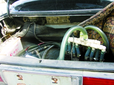 “為了避人耳目,大鐵箱被用布蓋著。鐵箱上連著直徑有5厘米粗、內(nèi)有鐵絲的硬質(zhì)塑料管,五六米長的管子上安裝有閥門、連接有油泵、進(jìn)出油過濾油器、開關(guān)等。原來轎車就是用這根‘長鼻子’把大貨車的油偷走了。”李靖明說。