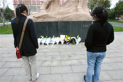 學(xué)生在擺放鮮花的雕塑前緬懷身亡的教授。本報(bào)記者張沫攝