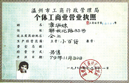 1980年12月11日,章華妹———一個(gè)19歲的溫州姑娘,從溫州市工商局鼓樓工商所領(lǐng)到了一張用毛筆填寫(xiě)的還附有她本人相片的“個(gè)體工商戶(hù)營(yíng)業(yè)執(zhí)照”。讓章華妹沒(méi)有想到的是,她領(lǐng)到的這張編號(hào)為10101的證書(shū),是中國(guó)第一張“個(gè)體工商戶(hù)營(yíng)業(yè)執(zhí)照”。