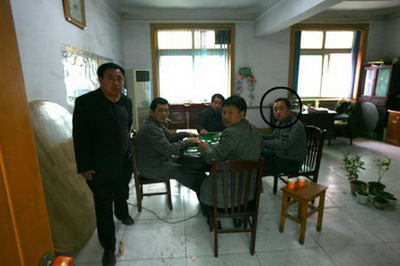 由于采訪需要,記者來到南柏舍鎮(zhèn)派出所。該派出所與鎮(zhèn)政府同在一個(gè)大院。在二樓,正當(dāng)記者尋找戶籍科時(shí),在西走廊第一個(gè)房間內(nèi),看到四名男子正在“嘩嘩”地洗著麻將牌,旁邊還有一名男子在旁觀。