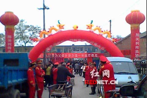 非常隆重,標(biāo)語(yǔ)有:某某個(gè)人為父老鄉(xiāng)親辦理一年醫(yī)療費(fèi)用……