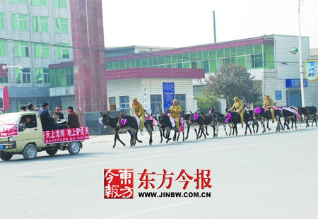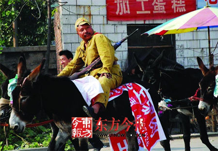 這支“耀武揚(yáng)威”的隊(duì)伍由四名身穿日本帝國主義軍裝、騎著毛驢的男子組成,由于他們牽的毛驢有十多頭,所以隊(duì)伍有二三十米長。在隊(duì)伍前方,一輛面包車上還有一支樂隊(duì),嗩吶聲、镲鈸聲不絕于耳,場(chǎng)面著實(shí)壯觀。