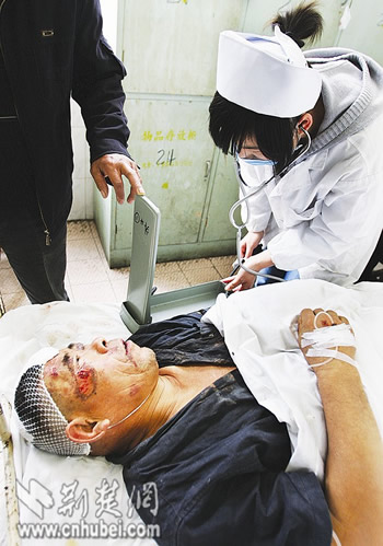 昨日中午,記者在漢川市人民醫(yī)院,見到了顱骨骨折的鄭某(如圖)。據(jù)他的親屬介紹,該村距武荊高速公路約200米。3日晚,他們討說法時(shí),遭施工人員毆打,其中一人顱骨骨折,多人身上有棒傷。