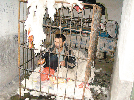 該村村民告訴記者,今年37歲的薛建倉在17歲時(shí)遭遇搶劫受到強(qiáng)烈刺激,患上精神分裂癥,十多年前其父因病去世,母親半身不遂臥病在床,薛建倉現(xiàn)由他的大姐照顧。2006年6月,薛建倉病發(fā)時(shí)將叔叔砍死,今年8月份,他又發(fā)病,一把火將自家房屋燒毀。由于發(fā)病時(shí)的薛建倉極具攻擊性,曾多次襲擊附近村民,并揚(yáng)言要?dú)⑷耍瑸榱巳迦说陌踩,村民與薛建倉的姐夫董選斌商量,在沒有想出好辦法之前,將薛建倉用鐵籠囚禁了起來。這個(gè)鋼筋焊成的鐵籠長(zhǎng)2米,寬1米,高約1.4米,一堆破碎的棉絮散落在籠內(nèi),薛建倉吃住就在其中。