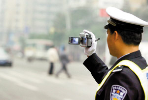 沙區(qū)交警在攝像糾違。交警以后將推行陽光執(zhí)法,在攝像點前擺放醒目標識。