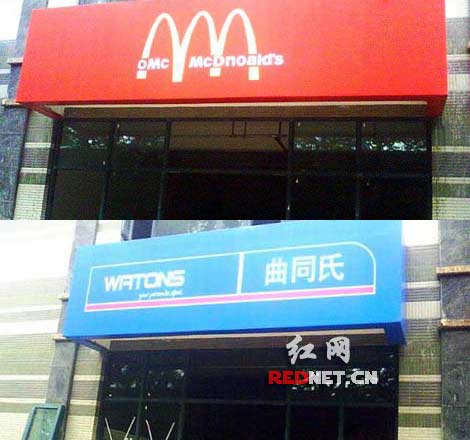 “這擦邊球打得很牛很雷人,真是山寨店鋪大薈萃。 8日晚上,網(wǎng)友“鍋爐工”在紅網(wǎng)論壇發(fā)帖爆料,稱在網(wǎng)上看到一個(gè)題為《對(duì)不起,我真的被雷到了,南京最雷人山寨店群》的圖片帖,圖片顯示在南京文安街上,林立的店鋪清一色是山寨名牌店鋪,其中屈臣氏、必勝客、麥當(dāng)勞、李寧、星巴克、哈根達(dá)斯等分別被克隆成曲同氏、必勝糊、李明、巴克星、哈根波斯等。