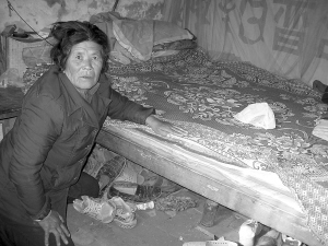 他們的住處,是一間大約10平方米的小屋。在這間局促的小屋中,擺了一張舊雙人木床,環(huán)顧四周,似乎再無擱腳之地。孫秀珍熱情地請記者坐下,記者四下看了一圈,才勉強找到一個學生使用的老式四腳條凳,一條洗得發(fā)白,已經看不出顏色的舊枕巾,被線繩牢牢地纏在凳面上。
