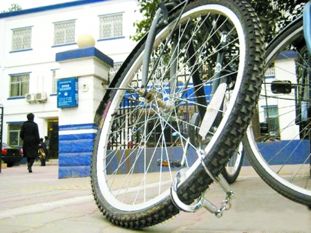 昨日下午6時許,按照網(wǎng)友提供的圖片,記者找到了鄭州市北林路派出所,此時門口已經(jīng)沒有用手銬鎖的自行車了。