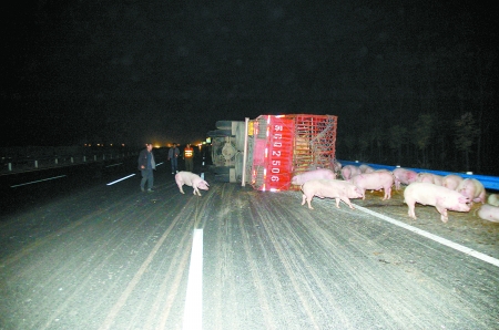 一輛滿載40多頭活豬的貨車側(cè)翻后,10頭豬當(dāng)場死亡,另外30多頭豬開始搖頭晃腦地在高速路上撒歡兒,這可把過往的司機(jī)嚇壞了,10多人組成的救援隊(duì)開始了持續(xù)一個半小時(shí)的“人豬大戰(zhàn)”。
