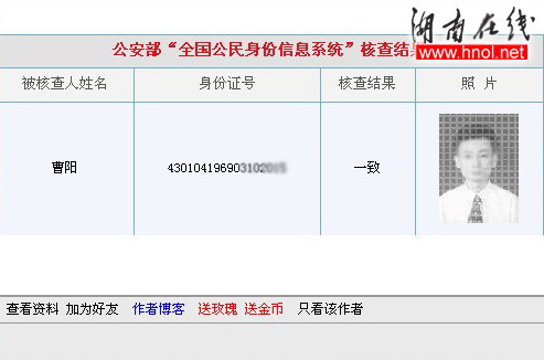 不少網(wǎng)友根據(jù)已有信息開(kāi)展“人肉搜索”,據(jù)網(wǎng)友“追尋者”提供的信息顯示,該男子系岳陽(yáng)市人大代表,69年出生,名叫曹陽(yáng)。一名網(wǎng)友更利用公安部新近開(kāi)通的“全國(guó)公民身份信息系統(tǒng)”將曹姓男子的身份證照片搜索出來(lái)并貼到網(wǎng)上。還有山東棗莊的網(wǎng)友提供了嫌疑男子的手機(jī)號(hào)碼及詳細(xì)住址,網(wǎng)友半信半疑,有網(wǎng)友更是試圖撥打號(hào)碼,但無(wú)法接通。