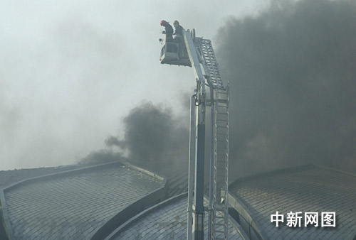 圖為濃煙滾滾的濟(jì)南奧體中心在建室內(nèi)項(xiàng)目比賽體育場館頂部。 楊東亮 攝