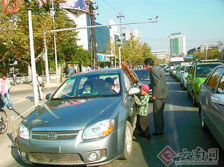 手拿雞毛撣子,見車停下等信號(hào)燈就趕忙上前掃車,當(dāng)車主打開車窗看究竟時(shí),立馬伸進(jìn)一只手并索要清潔費(fèi),你要不給錢接下來還有一招——下跪。近日,守在昆明市各大路口的要錢族又出新花樣——拿雞毛撣子掃車窗,有人戲稱他們是掃灰族。