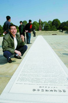 昨日上午,在劉少奇同志銅像前,李隆重將這幅書法長(zhǎng)卷徐徐打開!斑@幅作品用了11張宣紙,從標(biāo)題《論共產(chǎn)黨員的修養(yǎng)》到落款,一共是1100豎行,這些數(shù)字都寓意著紀(jì)念劉少奇同志誕辰110周年!崩盥≈匦χ嬖V來(lái)此參觀的游客。