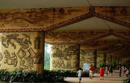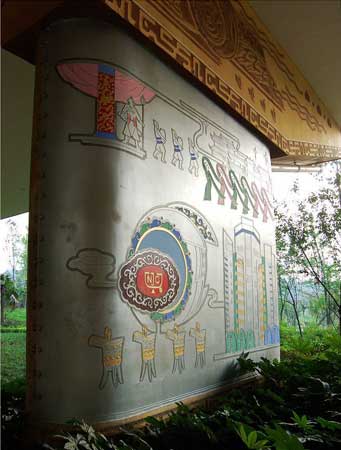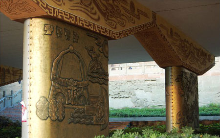 據(jù)有知情網(wǎng)友透露,這座“史上最牛的橋墩”來自四川德陽市鼓樓下的成綿高速高架橋橋墩。橫亙在鼓樓與廣場之間的高速公路橋墩,成了設(shè)計者發(fā)揮想象的地方。設(shè)計者將28個橋墩進行裝飾改造,以仿古浮雕銅板扣畫和仿敲銀浮雕扣版畫及大型仿烙鐵裝飾畫體現(xiàn)德陽6縣(市、區(qū))歷史文化、風景名勝、人文景觀及重裝基地風采。整個壁畫長廊立體感極強,既抽象又寫實,色彩明朗,極具現(xiàn)代藝術(shù)風格。彩虹橋、石刻、白馬關(guān)、龐統(tǒng)墓、倉山大樂、黃繼光紀念館、三星堆、年畫館、劍南春……德陽的標志一一在此得以展現(xiàn),每個篇章把歷史文化、風景名勝、人文景觀融為一體,形成一個完整的壁畫群落,壁畫面積達2309平方米,是整個德陽地區(qū)景點的微縮!笆飞献钆5臉蚨铡庇2007年初推出,并受到當?shù)仡I(lǐng)導(dǎo)的表揚。
