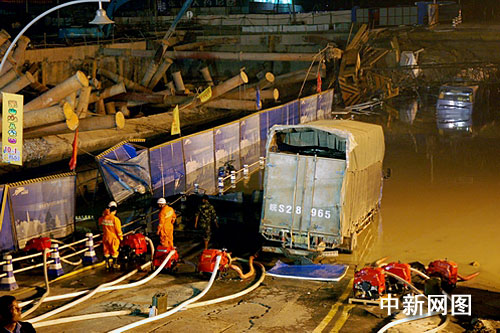 杭州消防支隊(duì)立即通知自來水公司對(duì)周圍市政水源和其他污水管道進(jìn)行關(guān)閥斷流;對(duì)事故現(xiàn)場(chǎng)比鄰已嚴(yán)重滲水的河流進(jìn)行加固攔堵。同時(shí),先后調(diào)集20臺(tái)手抬泵,在坍塌區(qū)域周邊搭建抽水平臺(tái)進(jìn)行作業(yè);另調(diào)集15臺(tái)潛水泵、6臺(tái)泥漿泵實(shí)施高密度不間斷抽水作業(yè)。
