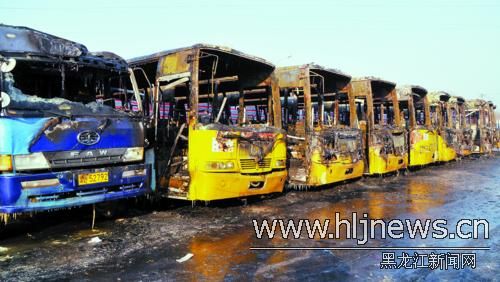21日清晨,在哈市香坊區(qū)薛家屯208路公交車終點站停車場內,一輛雙燃料公交車點火啟動時,由于工人違章操作致化油器回火并引發(fā)火災,停放在該車兩側的8輛公交車和1輛貨車被殃及。