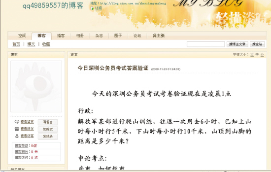 深圳公務(wù)員筆試在本月23日進(jìn)行,24日一早就有考生對記者反映:今年深圳公務(wù)員考試題泄露了,他已經(jīng)在網(wǎng)絡(luò)上見到了標(biāo)題為“今日深圳公務(wù)員考試答案驗證”的博客日志,顯示的發(fā)帖時間是23日的凌晨1時24分。該帖發(fā)布試題行政部分與“申論:房市、如何救市”的試題與他參加考試的試題完全一樣。