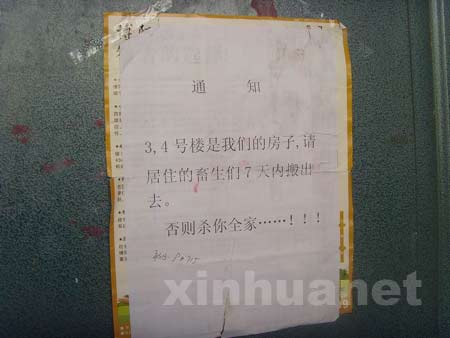 記者看到,這張被物業(yè)人員貼在一張房產廣告紙上的通知上寫著“3、4號樓是我們的房子,請居住的畜生們7天內搬出去。否則殺你全家………。!”的內容,而且沒有落款和時間!爱敃r我們立即報了警,但是18號晚上警察沒來。后來物業(yè)上通知各業(yè)主注意安全,晚上緊鎖門窗!蔽飿I(yè)辦公室主任說。