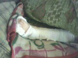 劉先生說(shuō),他看到X光片顯示,朱全超的腳踝已骨折。目前村民自發(fā)組織了1000多元的捐款,在勉強(qiáng)維持著朱全超的用藥。秋渠鄉(xiāng)衛(wèi)生院的醫(yī)生說(shuō),因?yàn)閭诟腥据^嚴(yán)重,如不能得到更好的治療,朱全超的一只腳可能要面臨截肢。熱心的劉先生用手機(jī)將現(xiàn)場(chǎng)的情況拍照發(fā)給記者,呼吁相關(guān)人士能關(guān)注這個(gè)不幸的家庭,為他們送上力所能及的幫助。