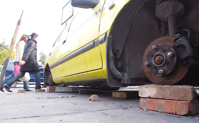 渝中區(qū)停車場的管理人員,為了防止車輛被盜竟想出奇招:將轎車輪胎卸下,然后在四個安輪胎的部位墊上磚頭。對此,他們對這一防盜術有些自鳴得意:“那些高科技的產品都不可靠,還是這種最科學,小偷再有本領,也只能望車興嘆!”