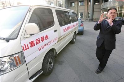 向央視春晚叫板,給全國人民拜年!弊蛱,朝陽區(qū)華嚴北里8號院2號樓下,一輛寫有挑釁口號的面包車惹得市民駐足觀看。這輛“牛車”的車主老孟說,要自辦一場草根參加的山寨版春晚,時間與央視春晚同步,通過網(wǎng)絡直播。目的就是向央視春晚叫板。