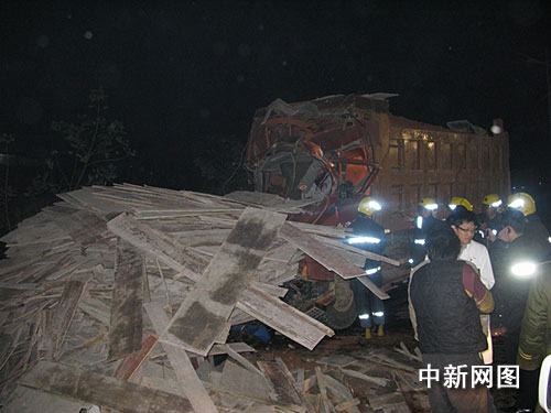 了解完情況后,救援工作有條不絮地展開,由于貨車車頭部分已經被卡車撞到路基邊,并且被木板給覆蓋,只有先救出卡車內被困司機,而后用拖車將卡車拖開,再進行營救貨車內3名被困人員。