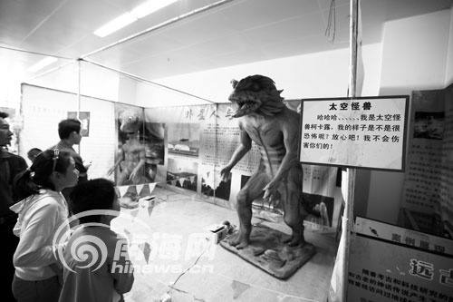記者進入展館內(nèi)看到,里面擺著一個個塑料制成的動物模型,接通電源,有人走過時模型會發(fā)出一些怪異的聲音。館內(nèi)有“太空怪獸”等幾十個大小不一的“動物”,工作人員稱這就是“外星人”。