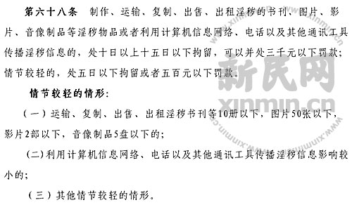 根據(jù)該局今日公布的《標(biāo)準(zhǔn)》第六十八條之規(guī)定:制作、運(yùn)輸、復(fù)制、出售、出租淫穢的書刊、圖片、影片、音像制品等淫穢物品,或者利用計算機(jī)信息網(wǎng)絡(luò)、電話以及其他通訊工具傳播淫穢信息的,處十日以上十五日以下拘留,可以并處三千元以下罰款;情節(jié)較輕的,處五日以下拘留或者五百元以下罰款。其中并沒有媒體所說的“3次”限制。
