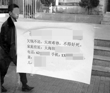 由于債務(wù)糾紛,煙臺(tái)一市民慘遭“大字報(bào)”惡意侮辱,其家庭住址、電話(huà)號(hào)碼,甚至妻兒姓名均被人張貼公布,并被詛咒“不得好死”。對(duì)于這種極端的做法,法律界人士認(rèn)為太荒唐。 12月1日13點(diǎn)50分,記者在煙臺(tái)市區(qū)大海陽(yáng)路仁愛(ài)醫(yī)院公交站點(diǎn)看到,眾多等車(chē)的市民湊在站牌下,圍觀一張貼在站點(diǎn)玻璃上海報(bào)一樣的紙張。記者看到,這張紙居然是一份“大字報(bào)”,上面寫(xiě)著“×××欠債不還,天理難容,不得好死”等內(nèi)容,并將“欠債者”的家庭住址、電話(huà)號(hào)碼、手機(jī)號(hào)碼以及妻子、兒子的姓名全部公布出來(lái)。在這份“大字報(bào)”旁邊,還有另一張內(nèi)容一樣的,只不過(guò)已被人撕去大半。候車(chē)市民見(jiàn)到這樣一張言辭惡劣的“大字報(bào)”,無(wú)不嘆息搖頭。