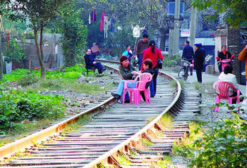 隨后,記者又從開(kāi)福寺路沿鐵路往南走,沒(méi)多遠(yuǎn)就看到10多位居民坐在鐵路上休息聊天,有的將椅子放置于鐵路的中央,有的則抱著孩子坐在枕木上,這些人若無(wú)其事地談笑著,根本沒(méi)有考慮到安全問(wèn)題。