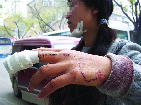 小李講述自己的遭遇時,顯得既激動又害怕,偶爾流下眼淚。她的下巴和左手中指都包扎著,左手背和袖口上還殘留著不少血漬。她還挽起褲管,小腿上可見片片淤青。