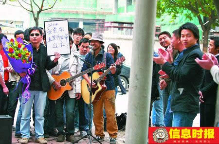 一名男子手持玫瑰花、高舉求愛宣言,并邀來(lái)樂隊(duì)助陣高唱情歌。昨日上午,珠江新城華利路附近某小區(qū)門口的新奇場(chǎng)面引來(lái)眾人圍觀。求愛男子自稱是在網(wǎng)上看到女主角所在單位為其做的征婚廣告,專程從哈爾濱趕來(lái),并想出這個(gè)主意以期望感動(dòng)對(duì)方。圍觀者紛紛質(zhì)疑這場(chǎng)“求愛秀”是商業(yè)單位的宣傳炒作。