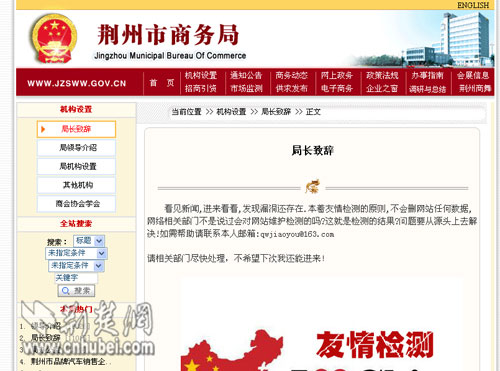 湖北荊州商務(wù)局網(wǎng)站再被黑 黑客留言稱友情檢測