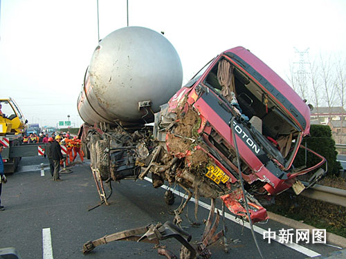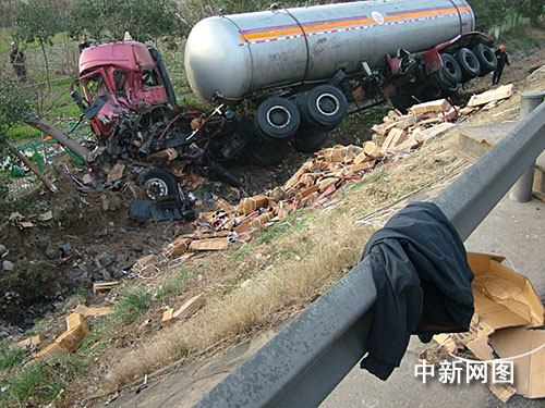 中新網(wǎng)淮安十二月九日電(朱曉穎 閻大偉)七日清晨五時(shí)三十分許,京滬高速江蘇淮安楚州段一輛載有一千六百四十箱、萬余把斧頭的大貨車與一輛裝有二十多噸液化氣的槽罐車相撞,由于巨大撞擊力,兩車均沖出護(hù)欄、側(cè)翻在路邊的溝中,所幸未造成人員傷亡。