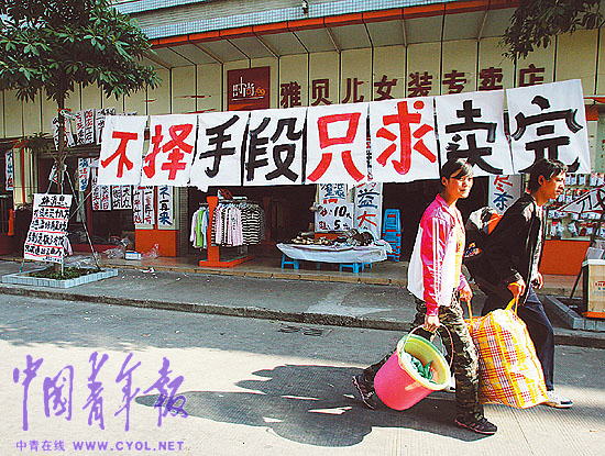 小李的老家在安徽阜陽,來東莞打工有6年了,他和愛人及兩歲大的兒子住在一處破舊的出租屋里。談起已經(jīng)離開工廠回家的同鄉(xiāng),小李感慨說:“現(xiàn)在回家又能怎么樣呢,農(nóng)村一家人才一畝多地,種什么都不劃算!睘榱损B(yǎng)家糊口,李剛不得不四處打聽找事做,后來在老板的默許下,他和幾個工友一起把倉庫里積壓的鞋子批發(fā)出來擺到街上去叫賣。小李每天起早貪黑、風餐露宿,雖然辛苦,他卻還很欣慰。“我這樣算是幸運的了,每天多少還有點錢掙,總比呆在家里沒事做好!彼f,他盼望著到年底了,買賣好起來,多掙點錢帶著老婆孩子回家過個好年。據(jù)了解,在當?shù)剡有好多人像小李一樣,做起了“出口轉內(nèi)銷”的小買賣。