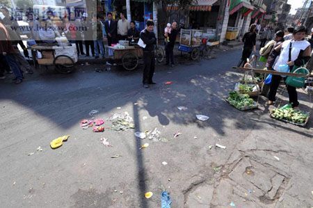 農(nóng)民工老熊是現(xiàn)場(chǎng)目擊者,他向記者描述了事情的經(jīng)過(guò):當(dāng)時(shí)老婦站在泉頭超市門(mén)前賣(mài)氣球,10時(shí)左右,一輛工具車(chē)開(kāi)過(guò)來(lái),聽(tīng)說(shuō)是城管來(lái)了。