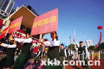 穿著統(tǒng)一服裝的學(xué)生高舉著“小平您好”、“中國(guó)崛起”、“胡哥加油”的標(biāo)語(yǔ)接受檢閱。昨天上午,北大附中廣州實(shí)驗(yàn)學(xué)校第六屆體育節(jié)的開(kāi)幕儀式基本上變成了“改革開(kāi)放三十年”成果展。