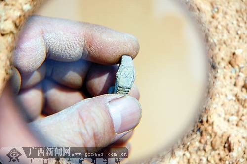 當(dāng)天,中央電視臺(tái)的兩名記者和中國(guó)古代銅鼓研究會(huì)理事長(zhǎng)、廣西文物專家組組長(zhǎng)、原廣西壯族自治區(qū)博物館館長(zhǎng)蔣廷瑜來(lái)到上思,對(duì)新近出土的兩具石棺進(jìn)行考察。中午11時(shí)許,考察報(bào)道組一行來(lái)到石棺出土現(xiàn)場(chǎng),對(duì)現(xiàn)場(chǎng)和周邊環(huán)境進(jìn)行考察時(shí),發(fā)現(xiàn)巨棺(較小那個(gè))出土的墓坑邊還有一塊重5公斤左右的三合土(巨棺由三合土制成)。當(dāng)有關(guān)人員挖出那塊三合土碎片時(shí),突然從三合土碎片底部掉下一個(gè)物品,碰到石頭時(shí)還發(fā)出了金屬撞擊的聲音。他們細(xì)心尋找,在掉落的地方發(fā)現(xiàn)了一枚“戒指”。