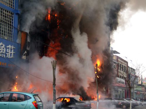 下午四點(diǎn),記者從中銀大道鑫源福瑞特超市出來(lái),發(fā)現(xiàn)北方有大量煙霧,順煙霧而去,在建設(shè)路口與消防車相遇,共同趕往事發(fā)地點(diǎn)。中銀大道已經(jīng)圍滿了人群,著火的商店火勢(shì)猛烈,被燒碎的玻璃啪啪直往下掉,門前的汽車也著了,一輛為晉M89550的紅旗轎車已經(jīng)燒的面目全非了。