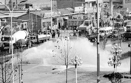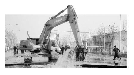 昨天下午14時(shí)當(dāng)記者趕到爆管現(xiàn)場時(shí)看到,爆管口還在不斷地向外噴水,爆管處的水泥馬路被強(qiáng)大的水壓徹底掀翻,大水涌向馬路南邊的育才學(xué)院和一家汽車專賣店。緊急之下,育才學(xué)院發(fā)動(dòng)師生搶險(xiǎn),用沙袋封堵了學(xué)校大門口。汽車專賣店來不急關(guān)門,半米高的大水柱涌進(jìn)店門將陳列的5輛汽車下半段浸泡,大水同時(shí)還涌進(jìn)一家公司庫房。據(jù)現(xiàn)場目擊者介紹,當(dāng)時(shí)轟隆一聲巨響,現(xiàn)場馬路中間裂開一個(gè)大口子,隨之向南育才學(xué)院方向傾斜著沖出7米左右高的水柱。由于水量很大,附近下水道不能及時(shí)排水,大水綿延到附近村莊。