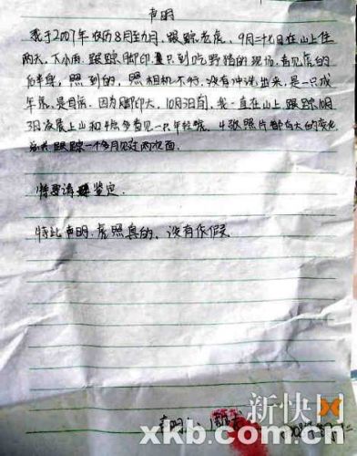 新快報(bào)記者接到的這份“聲明”全文如下:“我于2007年農(nóng)歷8月至九月,跟蹤老虎,9月二十七日在山上住兩天,下小雨,跟蹤腳印,只到吃野豬的現(xiàn)場(chǎng),看見虎的后半身,照到的,照相機(jī)不行,沒有沖洗出來,是一只成年虎,是母虎,因?yàn)槟_印大。10月3日前,我一直在山上,跟蹤10月3日凌晨上山和4點(diǎn)多看見一只年輕虎,4張照片都有大的變化,總共跟蹤一個(gè)月見過兩次面。特要請(qǐng)鑒定。特此聲明,虎照是真的,沒有作假。聲明人:周正龍。2008年冬月二十二”。