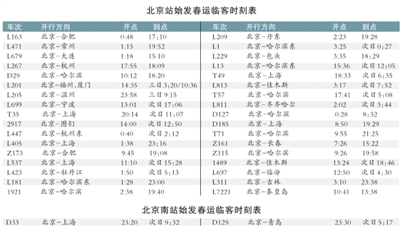 北京站相關(guān)負(fù)責(zé)人介紹,明年春運(yùn)該站加開(kāi)的臨客對(duì)數(shù)將創(chuàng)歷史之最,其中,D、Z、T字頭等高級(jí)別臨客占了三分之一,有10對(duì)之多,集中在北京至哈爾濱、上海、長(zhǎng)春、合肥等方向。據(jù)悉,這些臨客一改往年綠皮臨客的開(kāi)行狀況,到發(fā)時(shí)間與正常開(kāi)行列車(chē)的時(shí)間基本一致,極少出現(xiàn)晚點(diǎn)或者運(yùn)行時(shí)間長(zhǎng)等不利特點(diǎn)。