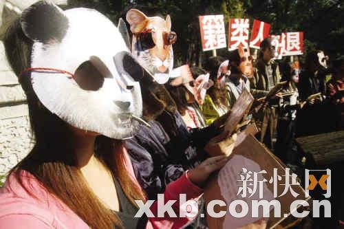 多名自發(fā)組織的志愿者頭戴面具,用行為藝術(shù)呼吁保護(hù)動物。許都/攝